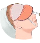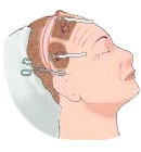 절개부위부터 아래쪽으로 눈썹이 위치한 곳까지, 이마피부와 근육층을 골막과 분리합니다. 분리하는 깊이는 다양한데 대개 피부 밑, 근막 밑, 골막 밑 중 하나를 선택합니다. |